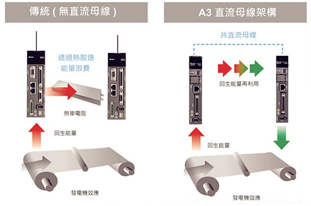 多臺(tái)驅(qū)動(dòng)器使用共直流母線功能,節(jié)省煞車電阻使用數(shù)量,降低成本